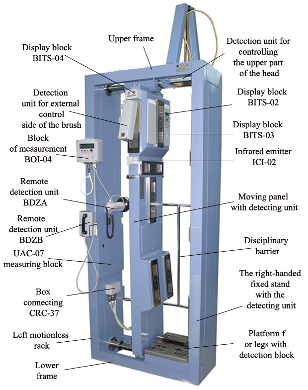 Is a rack with 18 stationary detection unit (hereinafter DU) BDZB and unit of measurement UAK-07 (located inside the installation). Basic version is equipped with a indicating unit BIC-03, which is shown as a symbolic circuit human figure is intended to indicate the pollution in each of the 18 fixed channels. Modification 20 has a display and keyboard unit BIC-02, by which we can derive the numerical results of measurements on each of the 18 stationary channels, as well as the trimming of radiometer. Basic version is equipped with a of radiometer DU for monitoring top of the head, placed on a movable axis. Position of DU for monitoring top of the head is regulated depending on the growth of human. Also present are stationary DU for monitoring back of the hand