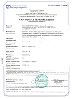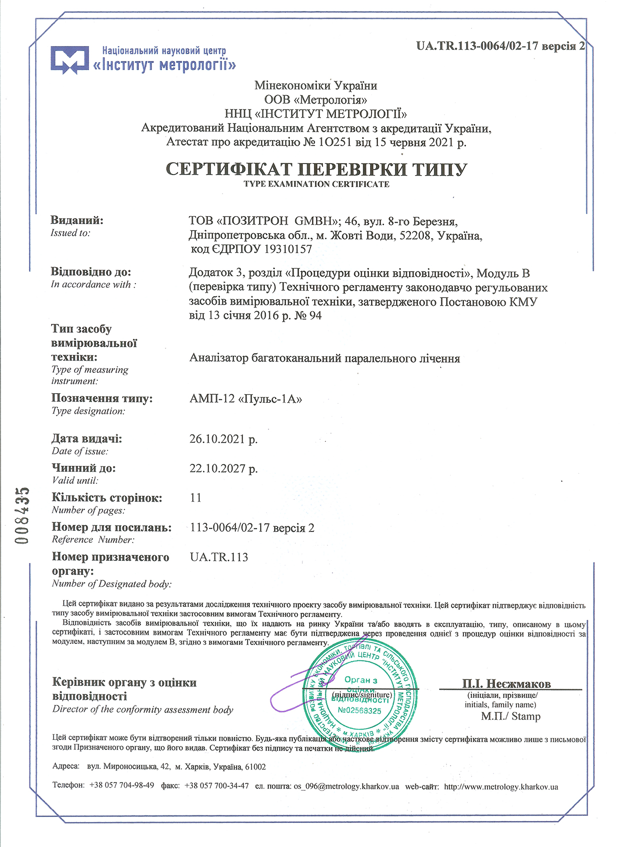 Аналізатор АМП-12 «Пульс-1А» пройшов приймальні випробування, оцінку відповідності технічним регламентам законодавчо регульованих засобів вимірювальної техніки затверджених Постановою КМУ №94 від 13.01.2016 р, має сертифікат перевірки типу № UA.TR.113-0064/02-17 версія 2 от 26.10.21 г. ТУ У 33.2-19130157-009-203.