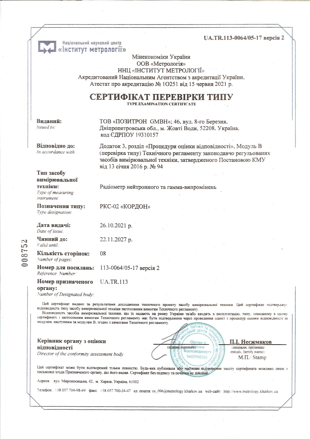 Радіометр нейтронного і гамма-випромінювання РКС-02 «Кордон» пройшов державні приймальні випробування оцінки відповідності технічним регламентам законодавчо регульованих засобів вимірювальної техніки затверджених Постановою КМУ №94 від 13.01.2016 р., має сертифікат перевірки типу № UA.TR.113-0064/05-17 версія 2 від 26.10.21 р