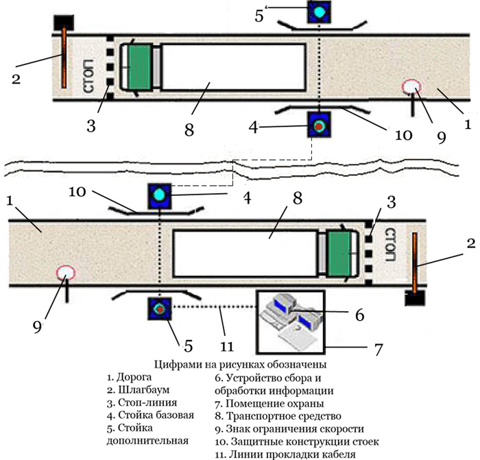 • Схема типового розташування радіометра; • Контроль двох смуг руху автотранспорту (вид зверху);Приклади встановлення радіометра РКС-02 «Кордон» на об'єктах замовників: